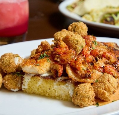 Grilled Barramundi NOLA, served with blackened crawfish tails, cornbread, crispy okra, pickled okra pico and a crawfish cream for $24.99